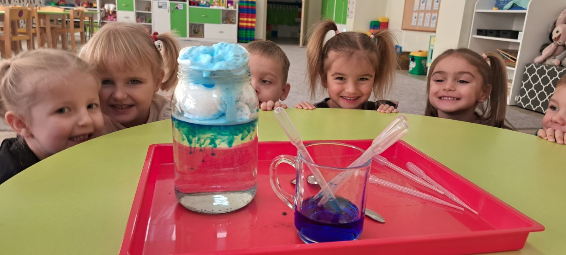 Grupa Sówek realizowała temat związany z pogodą, i bardziej szczegółowo rozmawiała o tym, jak powstaje deszcz, skąd biorą się chmury i dlaczego czasem pada mocniej, a czasem delikatnie. Przedszkolaki mogły samodzielnie odkrywać właściwości wody, wykonując różnorodne doświadczenia. Jednym z nich było malowanie kropli deszczu farbami na folii streczowej, dzięki czemu mogły rozwijać sprawność manualną. Następnie wykonały „deszcz w słoiku” – obserwowały jak przez piankę, która imitowała chmurkę, przenika zabarwiona woda niebieskim tuszem, co wizualizowało padający deszcz. Kolejnym zadaniem było psikanie wodą na chmurkę z niebieskiej bibuły, z której skraplał się deszcz. Ostatnim doświadczeniem było dmuchanie przez słomkę na kropelkę zabarwionej wody, które pozwoliło dzieciom sprawdzić, jak ruch powietrza wpływa na kierunek i kształt poruszającej się wody. Zajęcia dostarczyły przedszkolakom mnóstwo frajdy i jednocześnie pozwoliły im zrozumieć zjawisko deszczu poprzez bezpośrednią obserwację i zabawę.