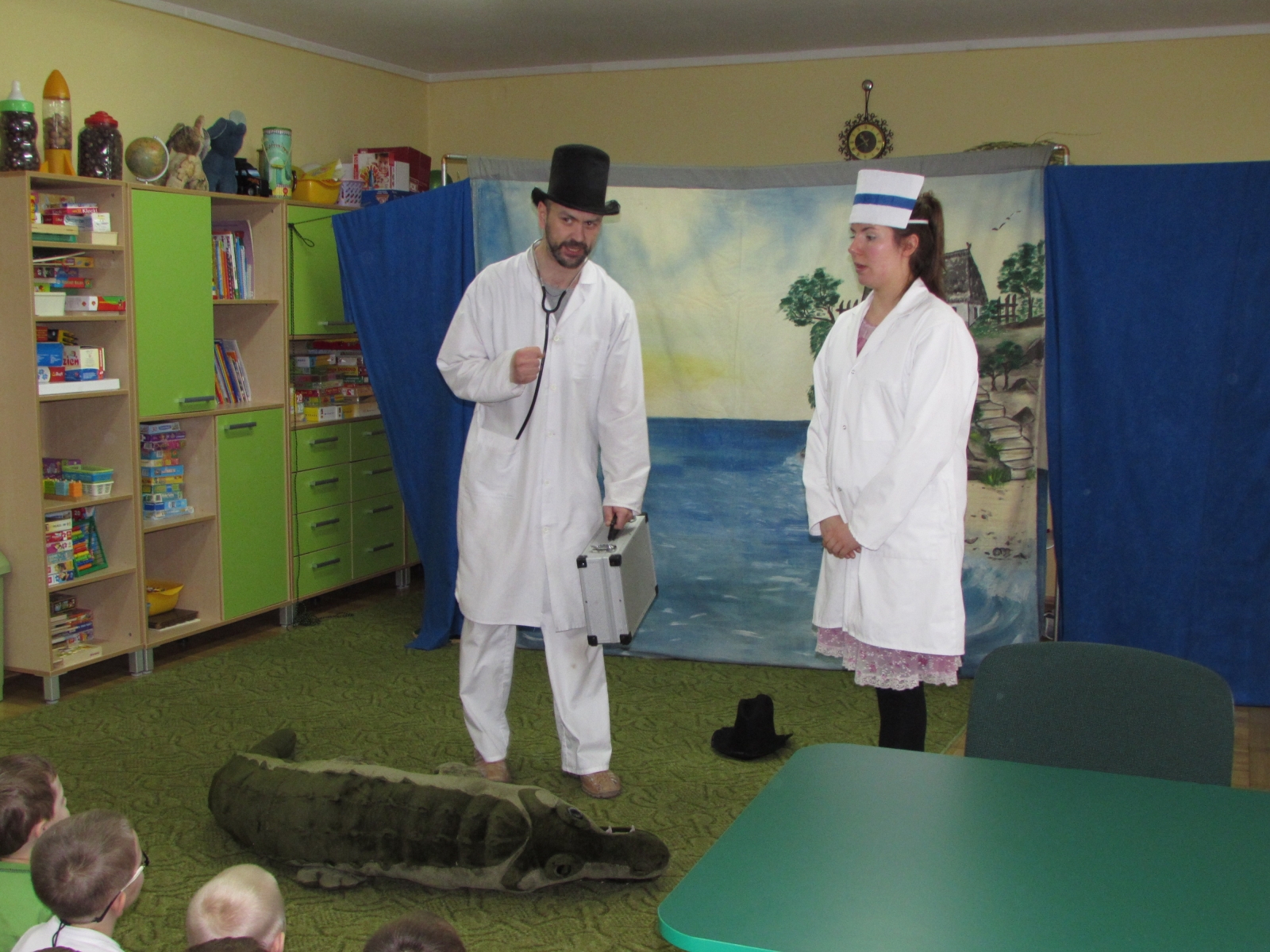 W piątek 5 lutego w naszym przedszkolu gościliśmy artystów ze Studia Małych Form Teatralnych, Scenografii i Reżyserii ART-RE z Krakowa. Zaprezentowali oni dzieciom przedstawienie zatytułowane „Doktor Dolittle i jego zwierzęta”. Przedszkolaki z zainteresowaniem śledziły przygody niezwykłego lekarza, który znał mowę zwierząt oraz potrafił wyjść cało z różnych opresji. Był przy tym bardzo uczynny i pomocny. Dzieci bawiły również towarzyszące doktorowi: świnka i zebra. Przedstawienie miało charakter interaktywny i przedszkolaki jak zawsze chętnie brały udział w jego współtworzeniu. Spektakl był dla nich źródłem humoru i pozytywnych emocji, a także skłaniał do zastanowienia nad własnym postępowaniem.