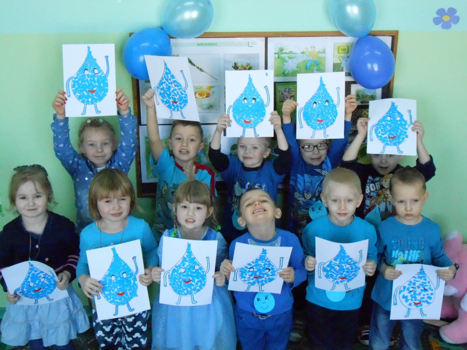 16 marca w naszym przedszkolu miał miejsce tzw. dzień „niebieski”. Dzieci przyszły tego dnia ubrane na niebiesko. W swoich grupach brały udział w różnorodnych zajęciach przygotowanych przez wychowawczynie – plastycznych, muzycznych, ruchowych, matematycznych, literackich i in. W związku z przypadającym w tym miesiącu Światowym Dniem Wody przedszkolaki ustaliły komu jest ona potrzebna oraz przypomniały sobie na czym polega obieg wody w przyrodzie. Najbardziej intrygowały je doświadczenia i zabawy badawcze. Dzieci uświadomiły sobie znaczenie wody oraz dowiedziały się jak racjonalnie z niej korzystać.