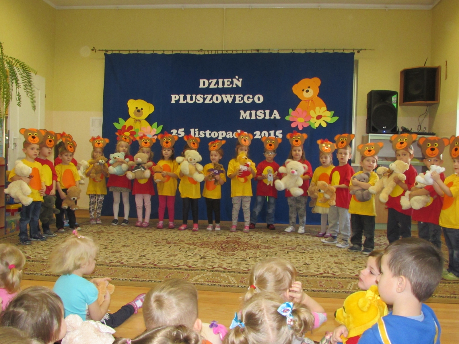 25 listopada obchodziliśmy Dzień Pluszowego Misia. Tego dnia dzieci przyniosły do przedszkola swojego pluszowego przyjaciela. Po wzajemnej prezentacji wszyscy obejrzeli okolicznościowy program artystyczny w wykonaniu dzieci czteroletnich z grupy III. Następnie odbyły się wspólne z misiami zabawy przy muzyce dziecięcej. „Misiowe tańce” przeplatane były zagadkami słownymi. Przedszkolaki rozpoznawały bohaterów znanych i lubianych bajek o misiach oraz miały okazję pochwalić się swoją wiedzą dotyczącą życia niedźwiedzi. Wspólnie uczestniczyły też w zabawie ludowej „Stary niedźwiedź”. Dzieci 4-letnie kolorowały sylwetę niedźwiadka, a 5 i 6-letnie dorysowywały na rysunku brakujące elementy. Zwieńczeniem dnia z misiami była bajka na tablicy interaktywnej „Klinika dla pluszaków”. Różnorodność proponowanych działań wyzwalała u dzieci różne rodzaje aktywności sprawiając im zarazem wiele radości.