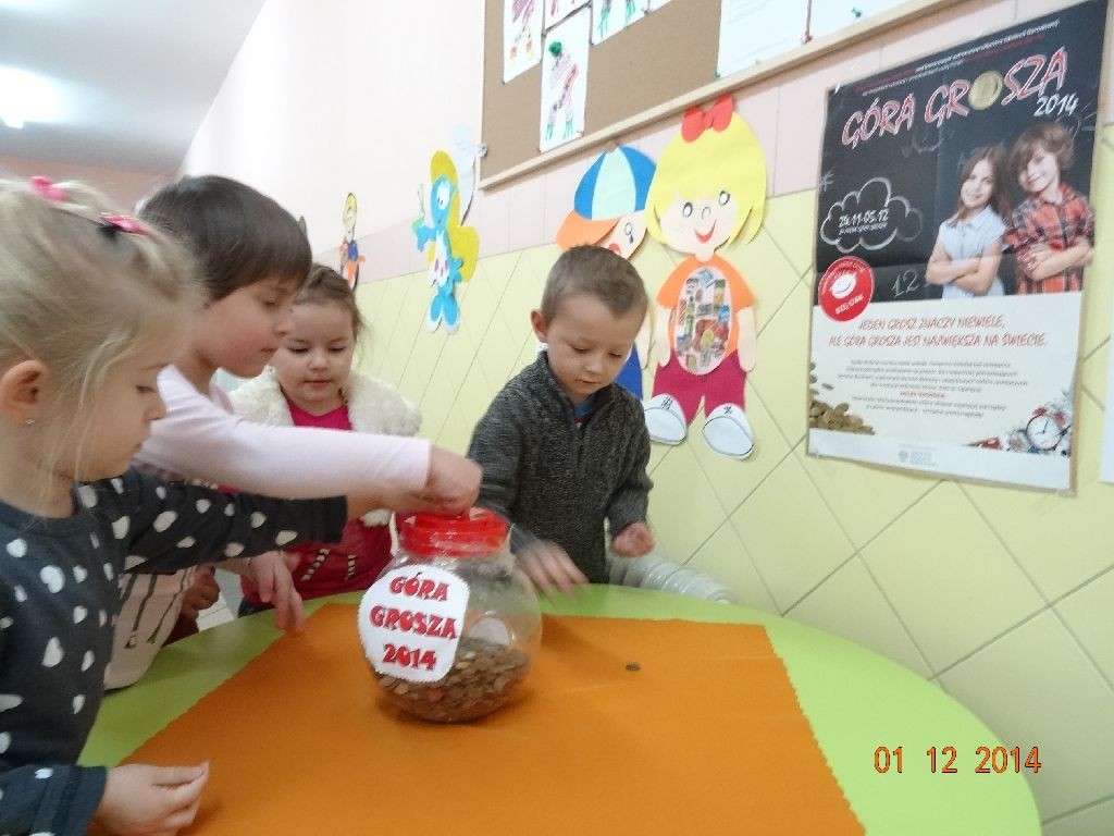 Nasze przedszkole po raz kolejny włączyło się do ogólnopolskiej akcji "GÓRA GROSZA". Polega ona na zbiórce monet (od 1 gr. do 5 zł). Patronat nad akcją obejmuje Minister Edukacji Narodowej, a jej organizatorem jest Towarzystwo Nasz Dom. Tegoroczna, piętnasta edycja trwała od 24 listopada do 5 grudnia 2014r.Celem akcji jest zebranie funduszy na pomoc dzieciom wychowującym się poza własną rodziną, w tym na tworzenie i dofinansowanie domów dla dzieci, rodzinnych domów dziecka, pogotowi rodzinnych, zawodowych rodzin zastępczych oraz dla najbardziej potrzebujących domów dziecka, które realizują prorodzinne programy wychowawcze. Ważne jest uświadomienie dzieciom, że najdrobniejsze monety zebrane w tak dużej ilości mogą stworzyć fundusz, dzięki któremu udzielona zostanie istotna pomoc bardzo wielu ich koleżankom i kolegom, którzy znaleźli się w najtrudniejszej sytuacji życiowej. Poza aspektami: wychowawczym i integracyjnym akcja ma również charakter konkursu – nagradzana jest placówka, która zbierze najwięcej groszy w całej Polsce i w danym województwie. Placówka nasza zebrała 7923 monety w kwocie 186,12 zł. Podsumowanie nastąpi po ostatecznym przeliczeniu monet przez Bank w terminie do 31 lipca 2015r. DZIĘKUJEMY WSZYSTKIM UCZESTNIKOM TEGOROCZNEJ AKCJI.