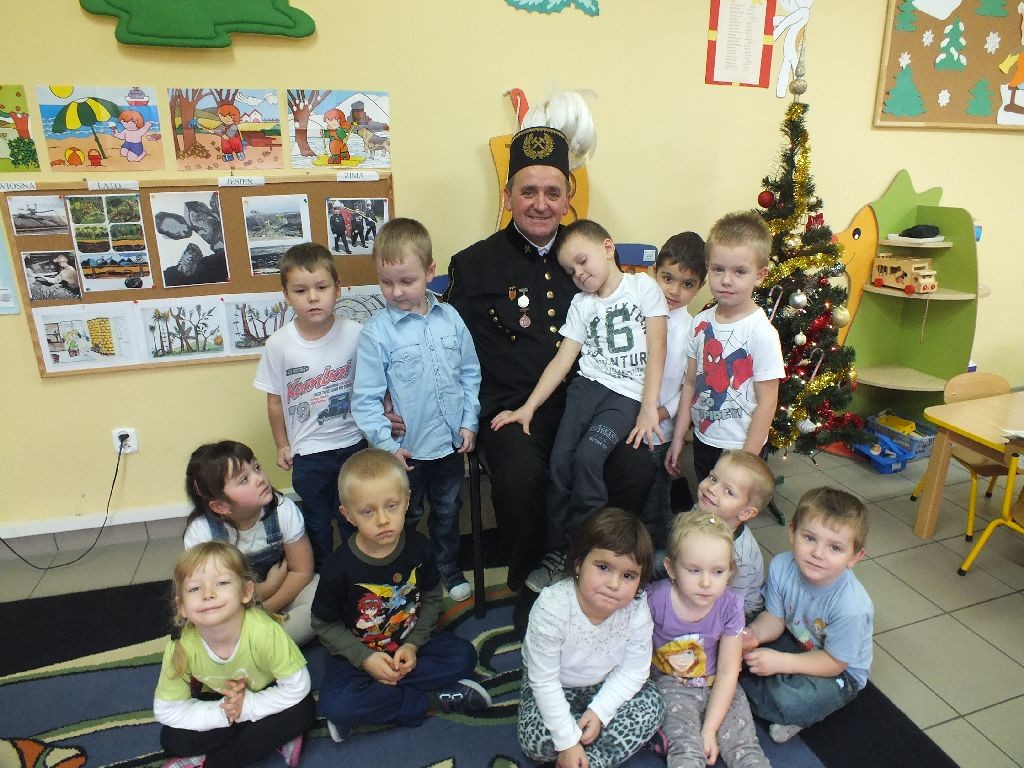 Grudzień jest miesiącem, który w naszym przedszkolu kojarzy się nie tylko ze Świętami Bożego Narodzenia, Świętym Mikołajem, ale także ze Świętą Barbarą i obchodami górniczego święta. Dnia 03.12.2013r. grupę VII odwiedził emerytowany górnik – dziadziuś Oskarka, p. Tadeusz Bortnowski, a dnia 09.12.2013 grupę VIII odwiedził jeszcze pracujący górnik, dziadziuś Wiktorii, Alanka, Jasia i Filipka pan Wojciech Gmach. Spotkanie to przybliżyło dzieciom trud górniczej pracy, ich poświęcenie dla nas wszystkich. Przedszkolaki z zainteresowaniem przyglądały się odświętnemu mundurowi i czapce górnika, która nazywa się czako i lśni na niej biały pióropusz. Z uwagą słuchały opowiadania o trudnej i niebezpiecznej pracy w kopalni. Górnik w grupie VII przyniósł dzieciom różne odmiany węgla, bursztyny, kamienie z wtopionymi muszlami oraz lampę naftową. Wszystkie dzieci mogły je dokładnie obejrzeć i dotknąć. Nasi goście obdarowali dzieci słodyczami i owocami. To spotkanie zakończyło się życzeniami od przedszkolaków z okazji Barbórki. Dzieci w obu grupach wyraziły je w formie wiersza, piosenki i własnoręcznie wykonanego upominku. Serdecznie dziękujemy panom górnikom za przybycie.
