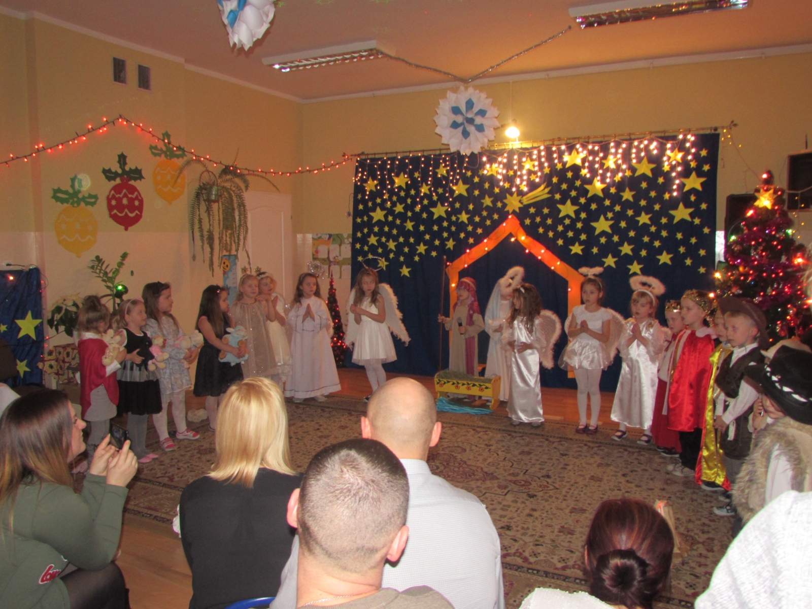 Boże Narodzenie, to święta niezwykłe. Czekamy na nie z utęsknieniem. Tradycją naszego przedszkola jest przygotowywanie i wystawianie jasełek przez starszą grupę przedszkolną. W tym roku przedstawienie jasełkowe miały przyjemność zaprezentować dzieci 5-letnie z grupy V. 21 grudnia zrobiły to dwukrotnie: przed południem dla całej społeczności przedszkolnej oraz pracowników naszej placówki a po południu dla swoich rodziców i zaproszonych gości. Przedszkolaki w przepięknych strojach recytowały swoje kwestie, śpiewały kolędy i pastorałki przybliżając wszystkim historię narodzenia Jezusa. Uroczystość swoją obecnością zaszczycili: z-ca wójta Gminy Malanów p. Piotr Cyls, ks. Marcin Zaworski, dyrektor przedszkola p. Agnieszka Mozio oraz nauczycielka religii p. Anna Walczak. Okolicznościowa dekoracja sali, blask świateł, ciepło świec i mrok za oknem sprzyjał świątecznej atmosferze i potęgował nastrój. Wszyscy w skupieniu obejrzeli jasełka. Nie mogło oczywiście zabraknąć tradycyjnego dzielenia się opłatkiem i składania sobie bożonarodzeniowych życzeń. Dzieci obdarowały wszystkich uczestników spotkania wykonanymi specjalnie na tę okazję choinkami. Ponadto dzieci zaśpiewały nastrojową piosenkę „Little snowflake” przygotowaną pod kierunkiem nauczycielki j. angielskiego w naszym przedszkolu p. Pauliny Miłowskiej. Po przedstawieniu wszyscy zasiedli do wspólnego stołu, by przy słodkim poczęstunku przygotowanym przez rodziców poczuć świąteczną, radosną atmosferę oraz wspólnie przeżywać cud Bożego Narodzenia. Wychowawczyni grupy V Elżbieta Bartosik składa serdeczne podziękowania Rodzicom za udział i zaangażowanie w organizację jasełek.