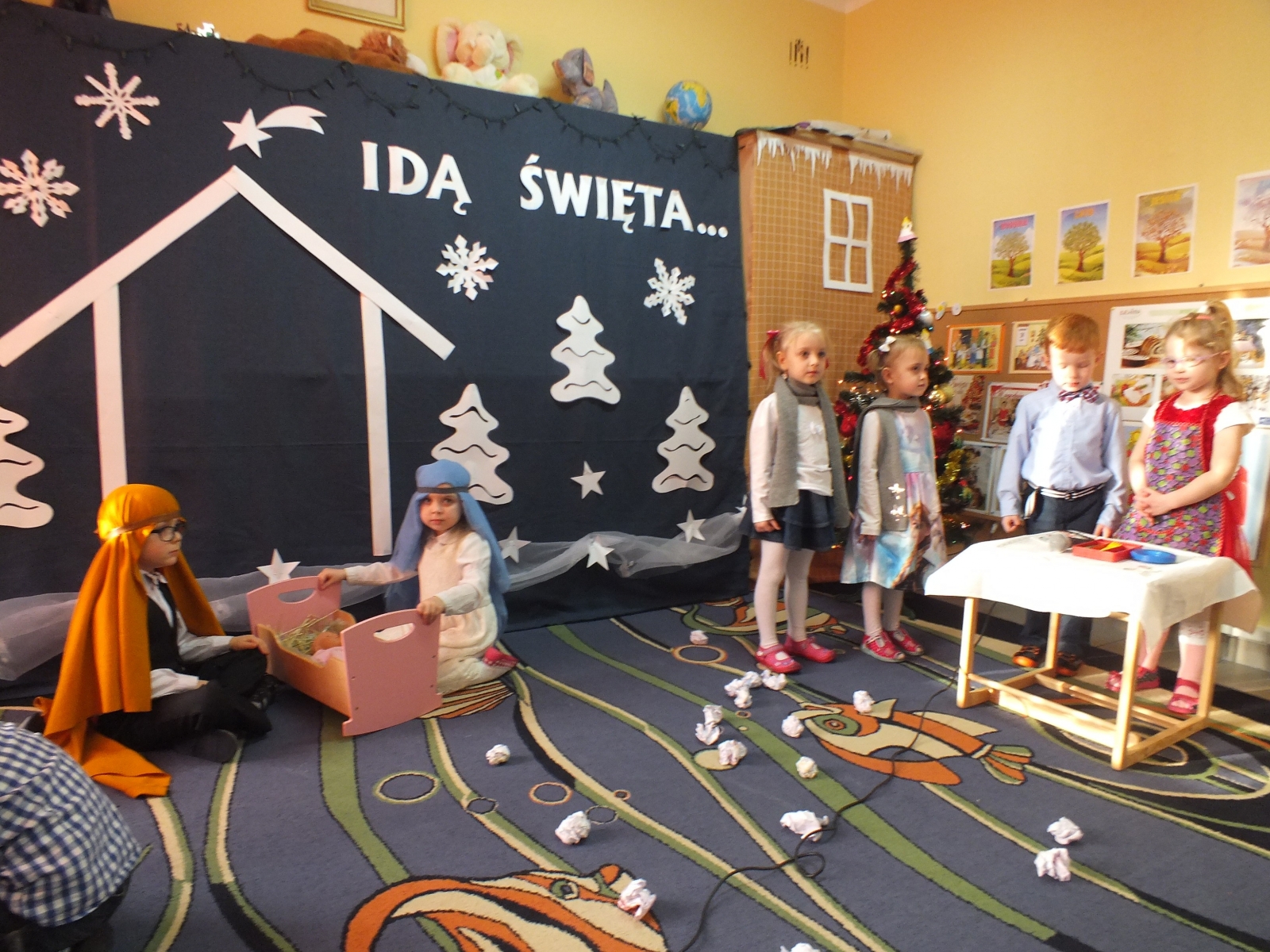 Radosną Nowinę Bożego Narodzenia w trakcie uroczystego występu ogłosiły dzieci z Oddziału Zamiejscowego w Dziadowicach dnia 18.12.2015r. Na uroczystość zostali zaproszeni pani wiceprzewodnicząca Rady Gminy Bożena Kołek, dyrektor Szkoły Podstawowej w Dziadowicach Renata Bińkowska oraz nasza pani dyrektor Przedszkola Agnieszka Mozio. Ciepła, świąteczna atmosfera tego dnia udzielała się dzieciom już od rana. Bardzo przejęte czekały na zaproszonych gości, aby zaprezentować „ Jasełka”. Tuż przed godz. 13.00 sala wypełniła się publicznością. Przedszkolaki w odświętnych strojach, w tle pięknej scenografii, recytując swoje role, śpiewając kolędy wprowadziły wszystkich w szczególny nastrój. A było na co popatrzeć! Była Maryja, Józef, malutkie dzieciątko Jezus, mama, tata, dzieci, sąsiad, gwiazdki. Po uroczystości dzieci otrzymały słodkie upominki od zaproszonych gości. Na zakończenie dyrektor przedszkola pani Agnieszka Mozio złożyła wszystkim świąteczne życzenia, a pani wychowawczyni grupy zaprosiła gości na słodki poczęstunek.