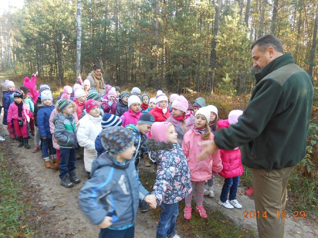 29 października 2014r. dzieci 5 i 6 - letnie z grupy V i VII wybrały się na wycieczkę autokarową do lasu w Dziadowicach. W lesie przywitał nas znajomy leśniczy pan Krzysztof Szczap. Celem wizyty była bezpośrednia obserwacja cech jesiennej przyrody i uwrażliwianie na piękno krajobrazu o tej porze roku. Pogoda na szczęście dopisała – od rana świeciło słońce i towarzyszyło przedszkolakom przez cały czas wędrówki. Z wielkim entuzjazmem wyruszyły na spacer leśnymi dróżkami. Już na początku dzieci stwierdziły, że gdy byliśmy w lesie wiosną słuchaliśmy jak las budzi się do życia, a teraz nie słychać ptaków, panuje cisza. Podczas spaceru podziwiały jesienne drzewa - ich różnorodne barwy i odcienie, oglądały wysokie dęby, pod którymi wybierały kolorowe liście. Pod drzewami iglastymi szukały najładniejszych szyszek, które zabrały do domów. Przedszkolakom udało się zobaczyć ślady – tropy pozostawione na leśnej drodze przez dzika.Pan leśniczy opowiadał o tym, jakie zwierzęta zamieszkują nasze lasy, które z nich zasypiają, jak przygotowują się do zimy, a które należy dokarmiać – pokazał przedszkolakom lizawkę: słup z solą dla zwierząt. Zwrócił także uwagę dzieci na rolę lasu w życiu ludzi i zwierząt, potrzebie jego ochrony oraz o zasadach właściwego zachowania się w lesie. Wycieczka do lasu była bardzo udana. Dzieci wróciły do przedszkola szczęśliwe, bogatsze o nową wiedzę i doświadczenia jakie zdobyły dzięki bezpośredniemu kontaktowi z przyrodą i własnej obserwacji. Dziękujemy panu leśniczemu za kolejną, ciekawą lekcję przyrody.