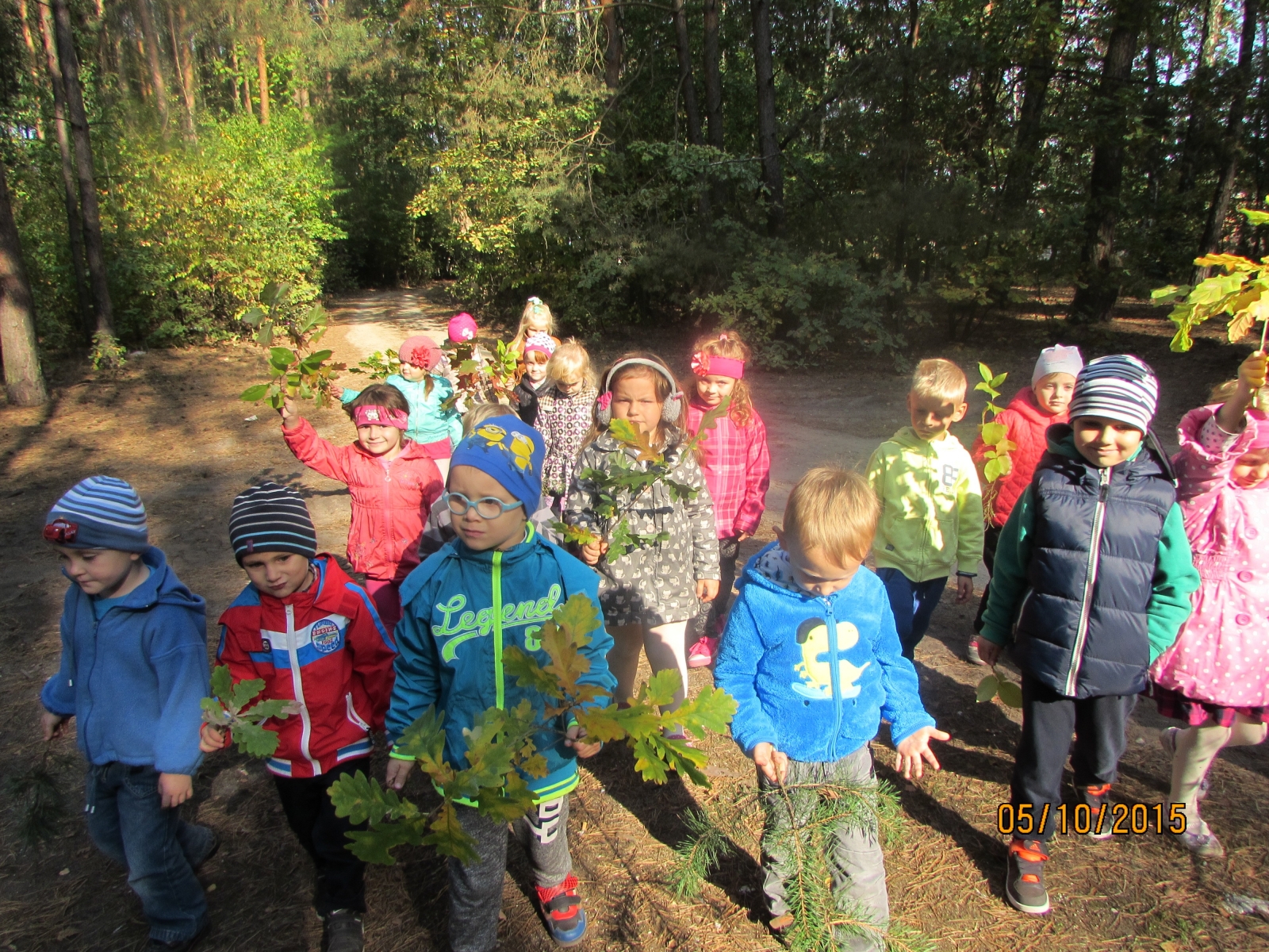 5 października dzieci z grupy III wybrały się na wycieczkę do lasu. Już podczas drogi obserwowały kolorowe jesienne kwiaty w przydomowych ogródkach, owoce głogu, śnieguliczki, ognika. Las przywitał dzieci ciszą, świeżym powietrzem i śpiewem ptaków. Przedszkolaki interesowało wszystko dokoła – sprawdzały jak wysoko sięgają korony drzew, podpatrywały owady spacerujące po mchu, dotykały korę drzew. Udało im się zaobserwować również sójkę i srokę. Podczas wędrówki przez las podziwiały kwitnące wrzosy, zbierały kolorowe liście, szyszki i żołędzie. Wycieczka była okazją wzbogacenia i utrwalenia wiadomości przyrodniczych dzieci, a także właściwego zachowania się w środowisku leśnym. Przyniesione dary lasu wzbogaciły znajdujący się w sali kącik przyrodniczy oraz przypominają ciekawą wyprawę.