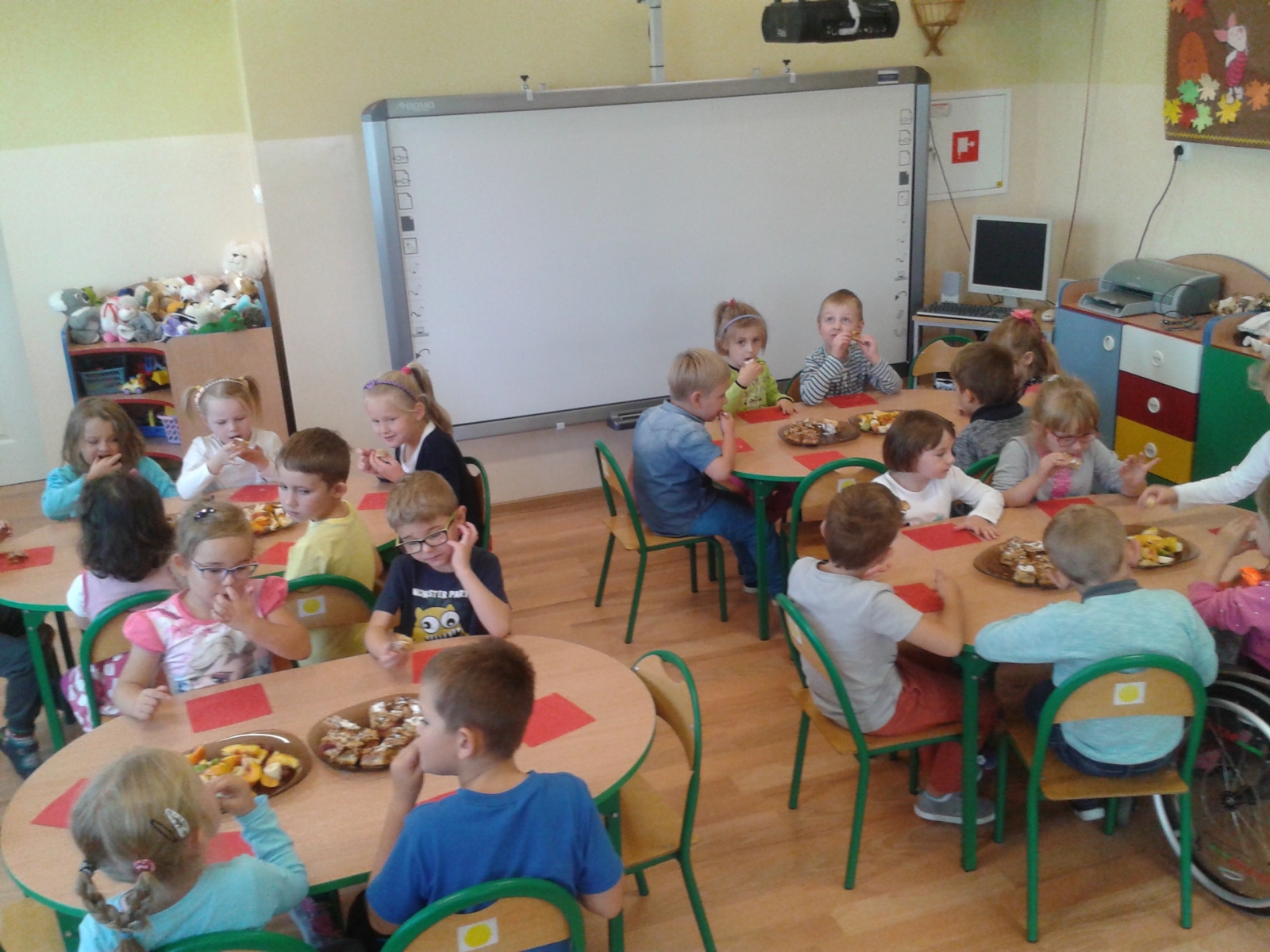 W związku z omawianym tematem o owocach przedszkolaki z grupy IV, 1 października postanowiły upiec ciasta owocowe. Wszystkie dzieci były bardzo zaangażowane w przygotowywanie ciast. Jedne siekały mąkę z margaryną, inne zagniatały ciasto, wałkowały, rozkładały owoce, jeszcze inne ubijały pianę, ucierały masę. Wszystkie czynności sprawiły dzieciom wiele radości. Z piosenką na ustach „Najłatwiejsze ciasto w świecie…” dzieci czekały, aż ciasta się upieką. Zapach, który roznosił się po całym przedszkolu wyostrzył wszystkim apetyt. W końcu doczekaliśmy się najprzyjemniejszego momentu – degustacji ciasta. Ciasta owocowe wszystkim dzieciom bardzo smakowały, o czym świadczyły puste talerzyki. Smakowały również wszystkim pracownikom przedszkola, których dzieci poczęstowały swoim wypiekiem.