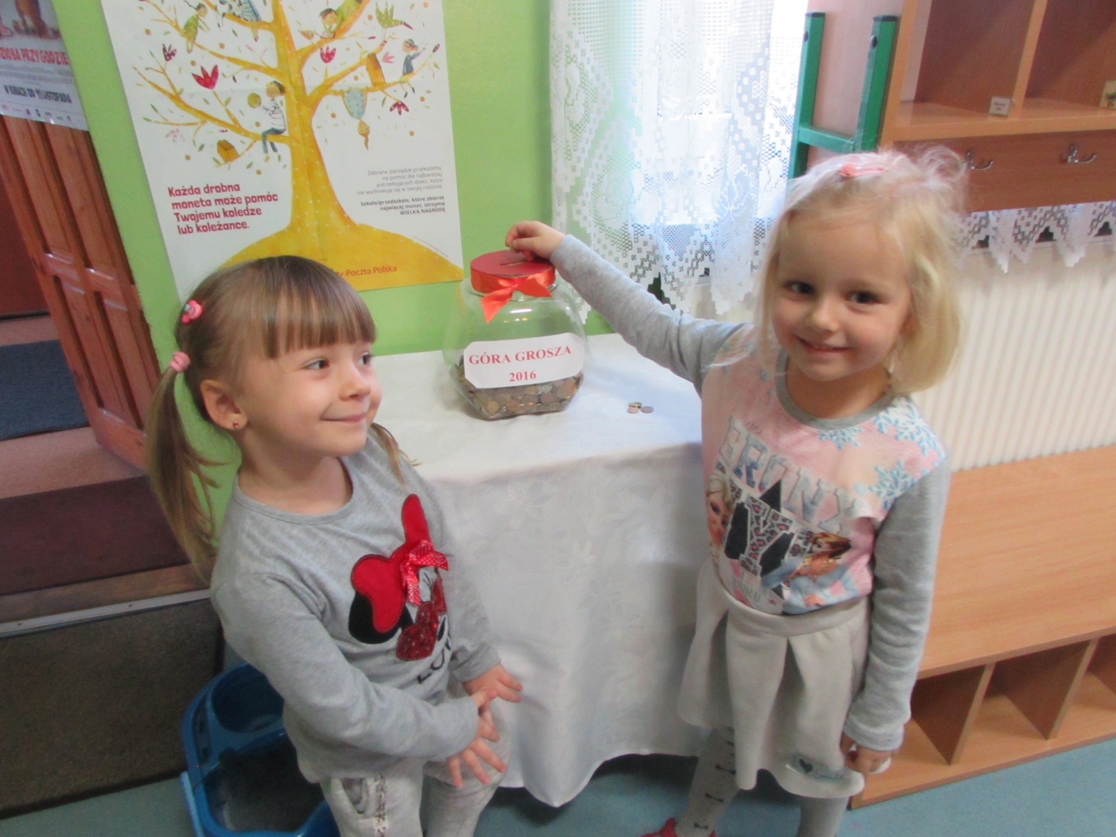Akcja rozpoczęła się 28 listopada i trwała do 9 grudnia 2016r. W tym czasie w każdym oddziale stanął specjalny słoik, do którego można było wrzucać „grosiki". Celem akcji było zebranie środków na pomoc dzieciom wychowującym się poza własną rodziną. Najdrobniejsze monety zebrane w tak dużej ilości mogą stworzyć ogromny fundusz, dzięki któremu udzielona zostanie istotna pomoc bardzo wielu koleżankom i kolegom, którzy znaleźli się w trudnej sytuacji życiowej. Uświadamiamy naszym przedszkolakom, że powinniśmy być wrażliwi i nieobojętni na los innych, że powinniśmy się zjednoczyć dla wspólnego dobra, dla wspólnego celu. W ramach akcji „Góra Grosza" udało nam się zebrać kwotę w wysokości 224,49zł.