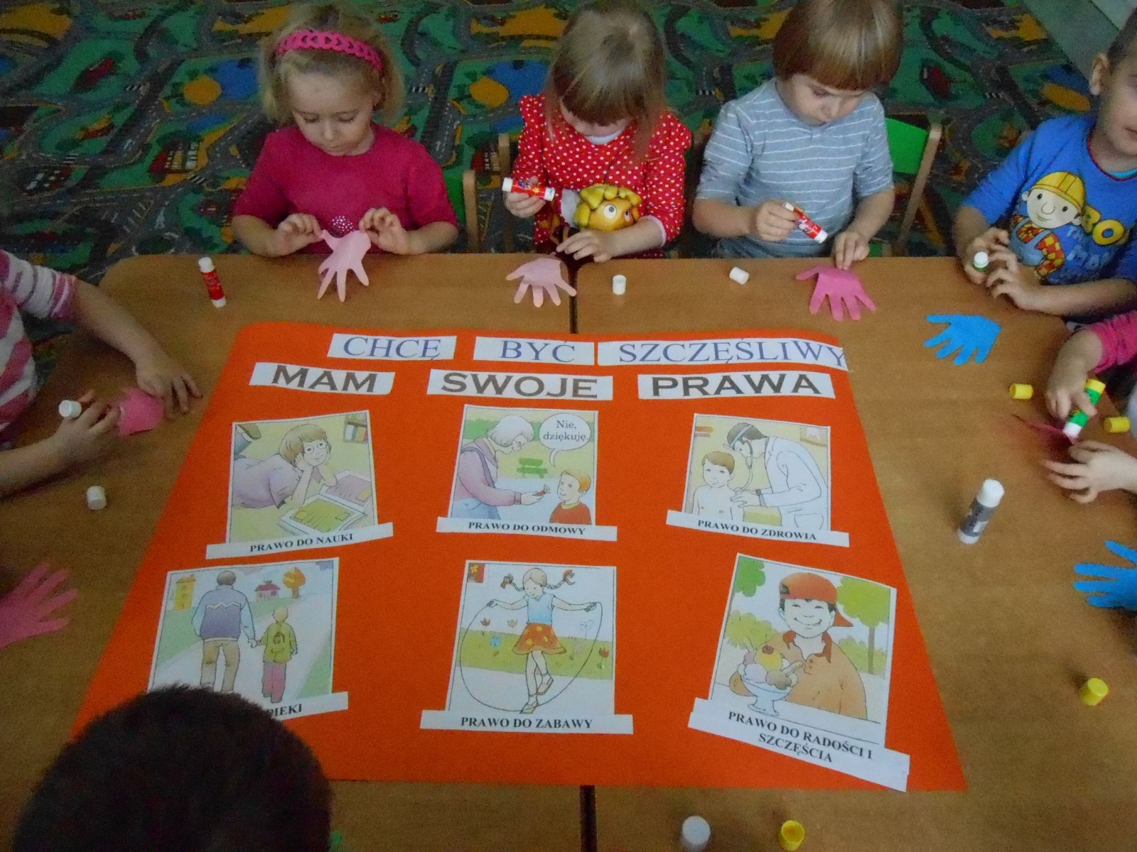Przedszkole jest jedną z pierwszych instytucji, z jaką styka się małe dziecko, i tak jak inne placówki oświatowe jest instytucją odpowiedzialną za dziecko, mającą wspomagać rodzinę w spełnianiu obowiązków nałożonych na nią przez Konwencję Praw Dziecka. To w przedszkolu dziecko zdobywa pierwsze informacje dotyczące swoich praw, uczy się poszanowania praw innych i radzenia sobie w sytuacjach naruszania praw własnych. Dlatego 20 listopada br. we wszystkich grupach naszego przedszkola obchodziliśmy Ogólnopolski Dzień Praw Dziecka. Przedszkolaki wykazywały ogromne zainteresowanie tematyką zajęć i chętnie brały udział w zorganizowanych przedsięwzięciach. Z tej okazji odbyły się pogadanki i rozmowy w oparciu o ilustracje i utwory poetyckie, zabawy i pląsy, zajęcia plastyczne. Dzieci dzieliły się własnymi doświadczeniami na temat towarzyszącym im w codziennym życiu różnym stanom emocjonalnym: uśmiechu, smutku, strachu, złości, itp. Przedszkolaki wiedzą już, że mają prawo m.in.: do opieki, radości, zabawy, nauki i poznawania ciekawostek otaczającego ich świata. Ten dzień był też świetną okazją dla nas – dorosłych, aby zawsze pamiętać, że dziecko jest małym człowiekiem, posiadającym własne uczucia, które należy szanować.
