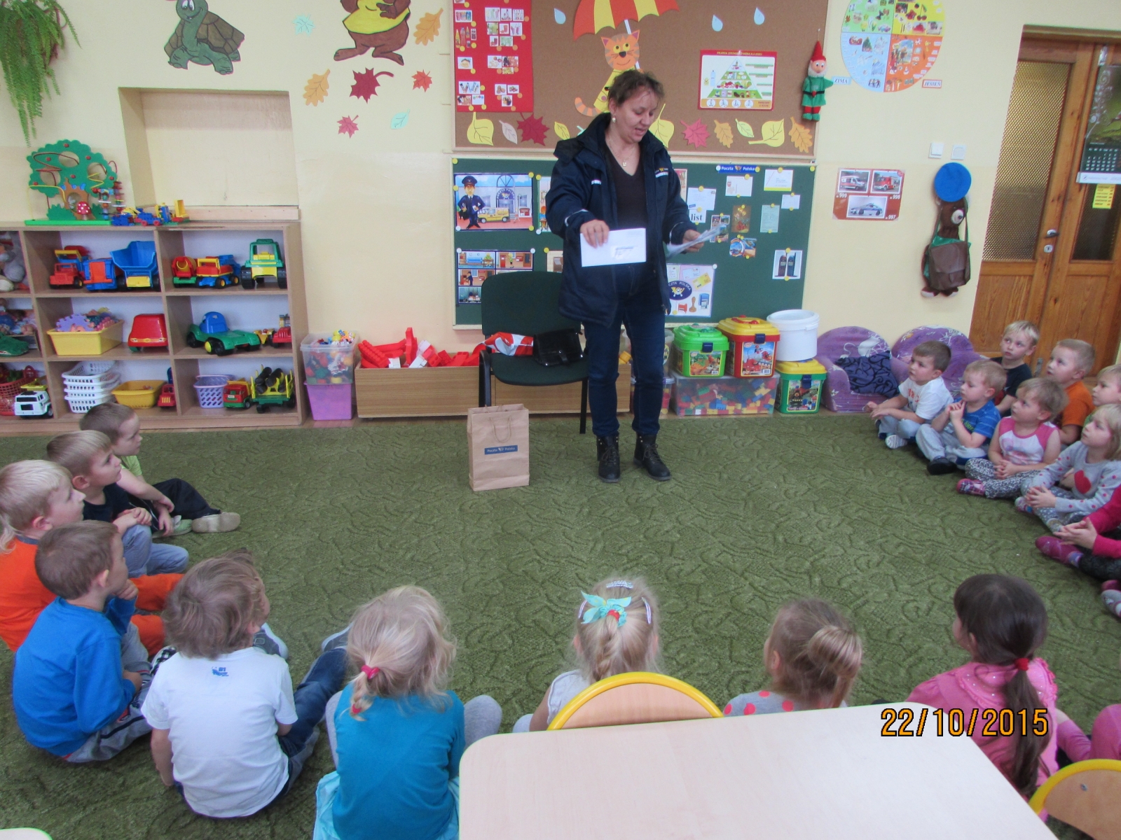 Przedszkolaki z grupy II i III poznawały znaczenie i funkcjonowanie urzędu pocztowego. Zapoznawały się z drogą listu od nadawcy do adresata. Utrwalały znajomość swojego nazwiska i adresu. 22 października dzieci odwiedziła pani listonosz Wioletta Gruszczyńska pracująca na co dzień w Urzędzie Pocztowym w Turku. Przedszkolaki miały okazję z bliska obejrzeć m.in. jej strój z logo poczty polskiej. Pani Wioletta opowiedziała dzieciom o swojej pracy, a także pokazała jak wyglądają listy, znaczki, przekazy, foldery i ulotki. Dzieci uważnie słuchały oraz obserwowały wszystko wyszukując znane im z zajęć symbole. Swoje wiadomości i wyrażenia związane z pocztą utrwalały potem podczas zabaw tematycznych w sali.