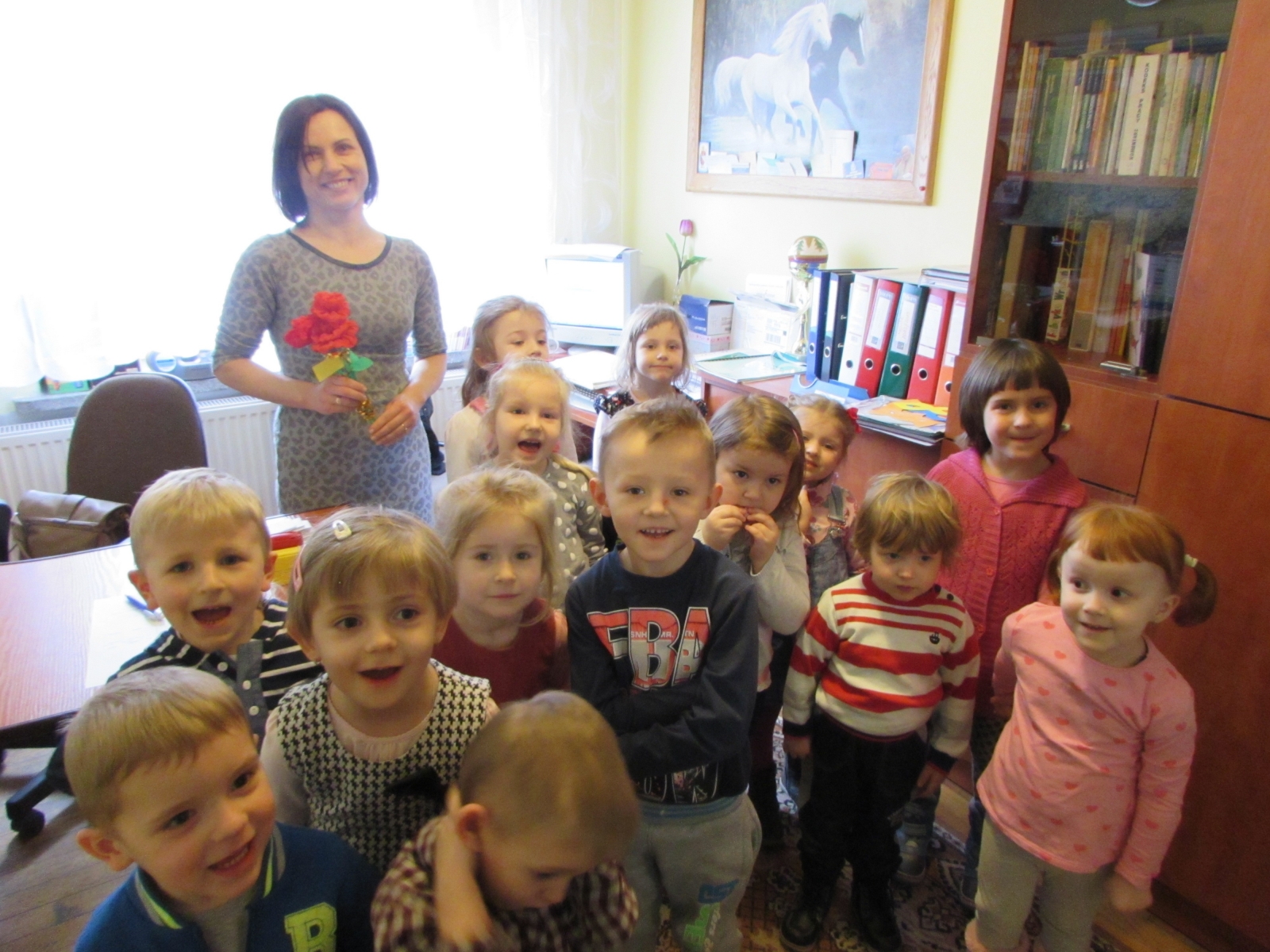 Najmłodsze przedszkolaki poznają charakterystyczne cechy zawodów z najbliższego otoczenia oraz ich społeczną użyteczność. Dzieci 3 i 4-letnie z grupy II podczas wycieczki do przedszkola przy ul. Słonecznej przekonały się na czym polega praca pani kucharki, intendentki czy dyrektora. Podczas zwiedzania kuchni miały okazję spotkać się z paniami, które przygotowują dla nich codziennie posiłki. Dzięki ich uprzejmości maluchy zaobserwowały jak działają różne urządzenia kuchenne – elektryczna patelnia, wyparzarka do naczyń, mikrofalówka, wyparzacz do jajek, wentylator, lodówka. Zauważyły, że niektóre bardzo różnią się od tych, które znają z domowych kuchni, chociażby wielkością. Przedszkolaki samodzielnie sprawdziły w jaki sposób waży się produkty spożywcze przy pomocy wagi. Dzieci dostrzegły porządek tu panujący, gdzie każde naczynie ma swoje miejsce. Wszystkie były bardzo zainteresowane kuchnią przedszkolną i obiecały zjadać wszystkie, zdrowe i smaczne posiłki jakie przygotowują dla nich panie kucharki. Przedszkolaki odwiedziły również panią intendentkę oraz panią dyrektor w jej gabinecie. Obie panie opowiedziały dzieciom o swojej pracy demonstrując im takie urządzenia jak komputer czy drukarka. Maluchy zobaczyły też pieczątki, telefon, segregatory i wiele innych przedmiotów, którymi posługują się na co dzień. Podczas wycieczki dzieci z grupy II poznały pracę pań w różnych zawodach i na różnych stanowiskach oraz związane z nimi zajęcia, wzbogaciły swoje wiadomości, słownictwo oraz uczyły się właściwego zachowania.