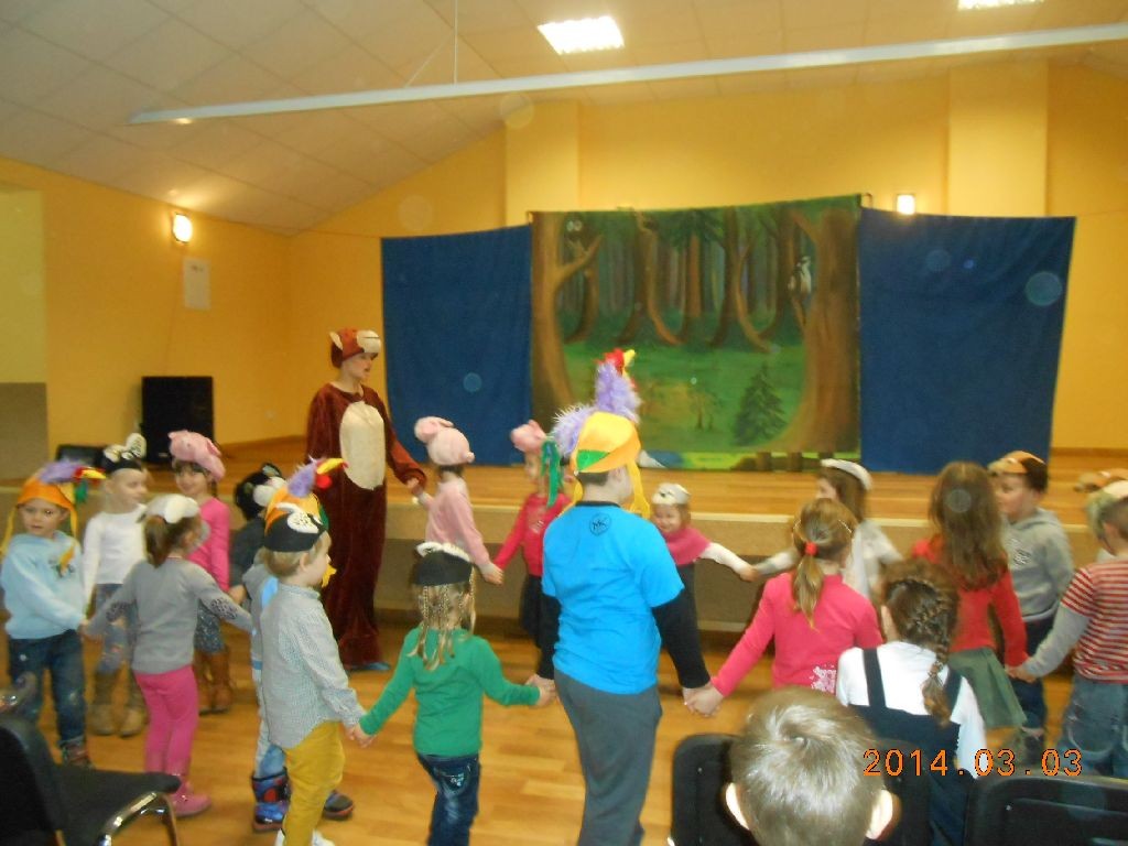 Przedszkolaki uczestniczyły dziś w ciekawym wydarzeniu. Na zaproszenie dyrektor Centrum Kultury i Sztuki w Malanowie p. M. Przygońskiej oglądały przedstawienie teatralne w Świetlicy Wiejskiej w Malanowie. Dla małych widzów wystąpili artyści ze Studia Małych Form Teatralnych, Scenografii i Reżyserii Art-Re z Krakowa w przedstawieniu „Małpka Fiki”. Dzieci zasiadając w sali na dużych krzesłach przed sceną mogły poczuć inną atmosferę niż w przedszkolu. Czuły się prawie jak w teatrze. Z ogromnym zaciekawieniem obejrzały przygody małpki podróżniczki i razem z nią poznawały różne zwierzęta, ich wygląd, głos, charakterystyczne cechy. Dostrzegały różnice i podobieństwa, poznawały zasady właściwego zachowania, uczyły się zrozumienia, szacunku i akceptacji bez względu na wygląd czy odmienność. Ponadto mogły aktywnie uczestniczyć w przedstawieniu wcielając się w role poszczególnych bohaterów. Odpowiadały też na pytania dotyczące posiadanych zwierząt i form opieki nad nimi, wymieniały przedstawicieli z rodziny kotów, ptaki itp. Udział w spektaklu dostarczył przedszkolakom wiele radości, wzbogacił je o nowe doświadczenia, a także poszerzył i utrwalił ich wiadomości przyrodnicze.