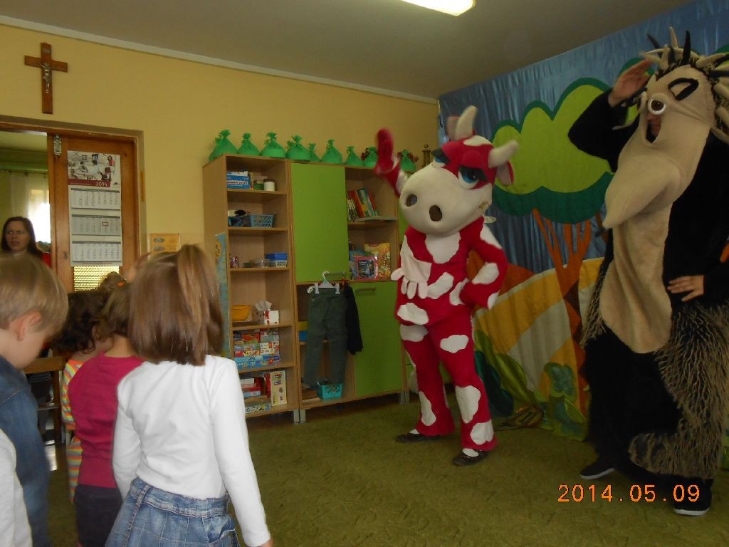 W dniu 9.05.2014r dzieci z naszego przedszkola obejrzały przedstawienie teatralne o tematyce zdrowotnej. Na na początek przedszkolaki usłyszały trzy gongi oznaczające rozpoczęcie spektaklu, tak jak w prawdziwym teatrze. Główny bohater przedstawienia jeż Henio, spotkał w lesie jeżozwierza Olego. Zwierzątka sprzeczały się, kto jest szybszy -zwierzęta z Polski czy też z Afryki. Każdy z nich wystawił do wyścigów swojego zawodnika: zwierzęta z Afryki reprezentować miała bardzo sprawna biegaczka zebra Olisa, zaś na biegacza z Polski jeż zaproponował krowę Manię Malinową. Krówka nie chciała brać udziału w biegach, twierdziła, że nie potrafi, że nie ma formy. Jednak poprzez bardzo trudne i żmudne ćwiczenia pod opieką zajączka krowa zdobyła taką formę, której nawet on sam by się nie powstydził. W końcu nadszedł dzień wyścigu i zwierzątka stanęły na mecie. Bardzo pewna swego zwycięstwa zebra nie doceniła krówki Mani Malinowej, która dzięki bardzo ciężkiej pracy zdobyła taką kondycję, że pokonała w czasie wyścigów swą rywalkę.Poprzez to przedstawienie dzieci dowiedziłay się, że dzięki żmudnym ćwiczeniom i woli walki można pokonać wszystkie przeciwności i nawet ciężka niezgrabna krowa może pokonać zwinną biegaczkę zebrę. Dzieci bardzo aktywnie włączały się w przebieg przedstawienia i z wielkim zaangażowaniem dopingowały krówkę, by osiągnęła swój cel. Z niecierpliwością czekamy na kolejne przedstawienia.