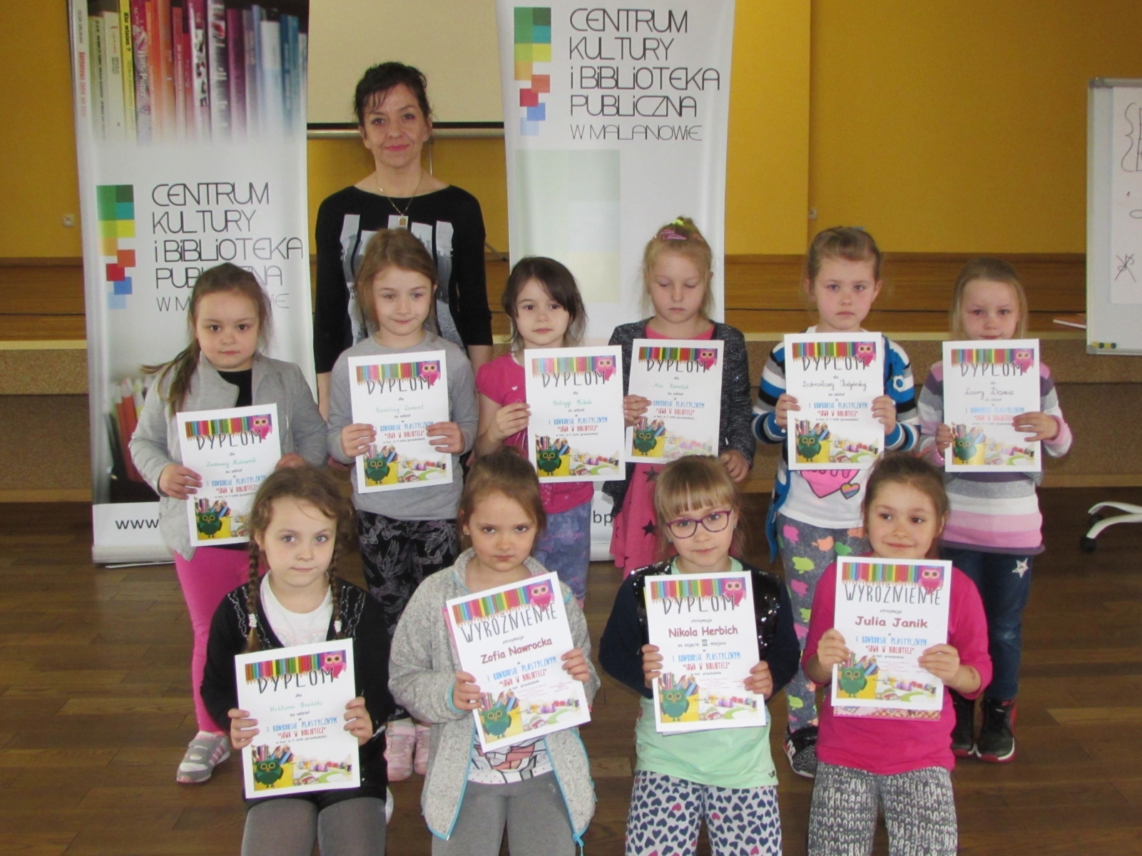 28 kwietnia przedszkolaki z gr V i VII odwiedziły bibliotekę w Malanowie. Podczas spotkana dzieci wysłuchały bajki pt: "Jak skrzat Jagódka zakładał bibliotekę" E. Stadtmüller, którą przeczytała im pani Joasia. Następnie otrzymały dyplomy za udział w konkursie „Sowa w bibliotece”. Z naszego przedszkola zostało przekazanych 8 prac z czego: Nikola Herbich z gr VII zajęła III miejsce a jej koleżanki Zosia Nawrocka z gr VII i Julia Janik z gr V otrzymały wyróżnienie. Na zakończenia dzieci obejrzały prace konkursowe. Wszystkim uczestnikom gratulujemy i życzymy dalszych sukcesów.