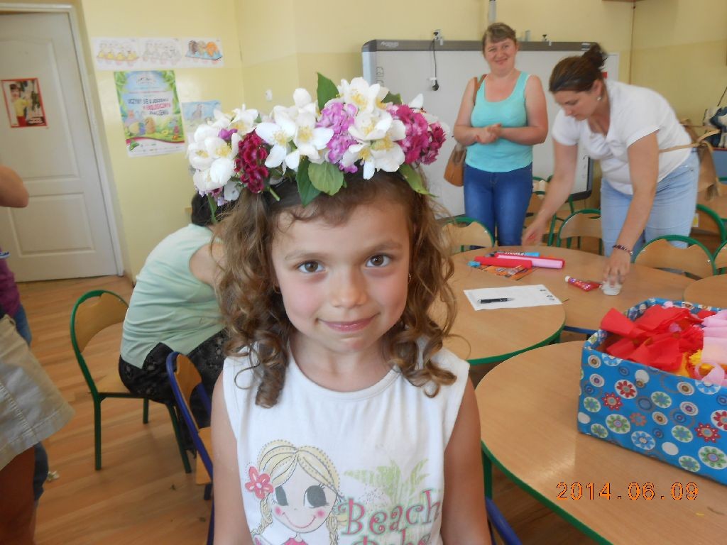 Czerwiec to nie tylko myśli o zbliżających się wakacjach, ale również miesiąc pełen wydarzeń w naszym przedszkolu. Jednym z nich były warsztaty dotyczące podtrzymywania tradycji świętojańskich. W dniu 9.06.14r. dzieci z grupy V gościły swych rodziców, panie ze Stowarzyszenia Emerytów - Marię Mrugas i Bronisławę Woźniak oraz Karolinę Podgajną – koordynatorkę projektu, którego jednym z elementów było właśnie to spotkanie. Na początku M. Muszyńska opowiedziała o tradycjach świętojańskich, o plecieniu wianków i znaczeniu puszczania ich na wodę. Potem wypadało już tylko przystąpić do działania. Wszyscy robili piękne kwiaty, a panie ze Stowarzyszenia opowiadały, jak to bywało dawniej. Pani Maria pokazała, w jaki sposób pleść na kole wianki z żywych kwiatów. W ten sposób powstały piękne dekoracje zdobiące głowy dziewczynek. Przygotowane wianki zostaną wykorzystane jako elementy stroju dla dziewczynek w czasie spotkania z okazji Nocy Świętojańskiej. Serdecznie dziękujemy wszystkim, którzy zechcieli wspomóc nas swoimi umiejętnościami. To było bardzo pouczające i miłe spotkanie.
