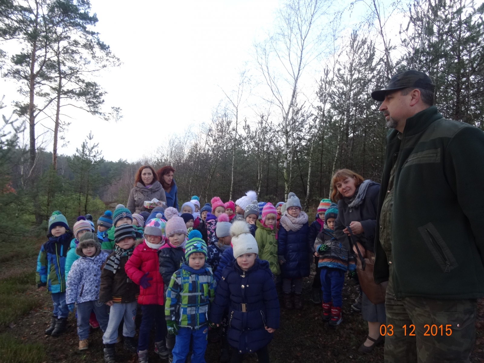 W czwartek, 3 grudnia 2015 dzieci z grupy II i III wyruszyły na wycieczkę do lasu. W Dziadowicach czekał na nie leśniczy – p. Krzysztof Szczap. Las przywitał przedszkolaków ciszą i świeżym powietrzem. Podczas pieszej wędrówki leśnymi duktami dzieci obserwowały otaczającą przyrodę, słuchały opowiadania pana leśniczego, zadawały pytania. Dowiedziały się wielu ciekawych rzeczy na temat drzew, jesiennych zwyczajów zwierząt leśnych, pracy leśnika itp. Uważni obserwatorzy oglądali ślady zwierząt: dzika, łosia, jelenia, a w górze budki lęgowe dla ptaków. Plastikowa butelka porzucona przez ludzi stała się pretekstem do przypomnienia zasad właściwego zachowania się w lesie. Dzieci zastanawiały się też jak zwierzęta przetrwają zimę oraz czy można im w tym pomóc. Przedszkolaki nauczyły się rozróżniać drzewa iglaste oraz dowiedziały, że świąteczne drzewka należy zakupić na specjalnej plantacji. Do przedszkola wróciły obdarowane pięknym świerkiem, który ozdobi nasze przedszkole, umili spotkanie z Mikołajem oraz będzie przypominało wszystkim o zbliżających się świętach. Dziękujemy panu leśnikowi za mile i pożytecznie spędzony czas w leśnej scenerii oraz za choinkę.