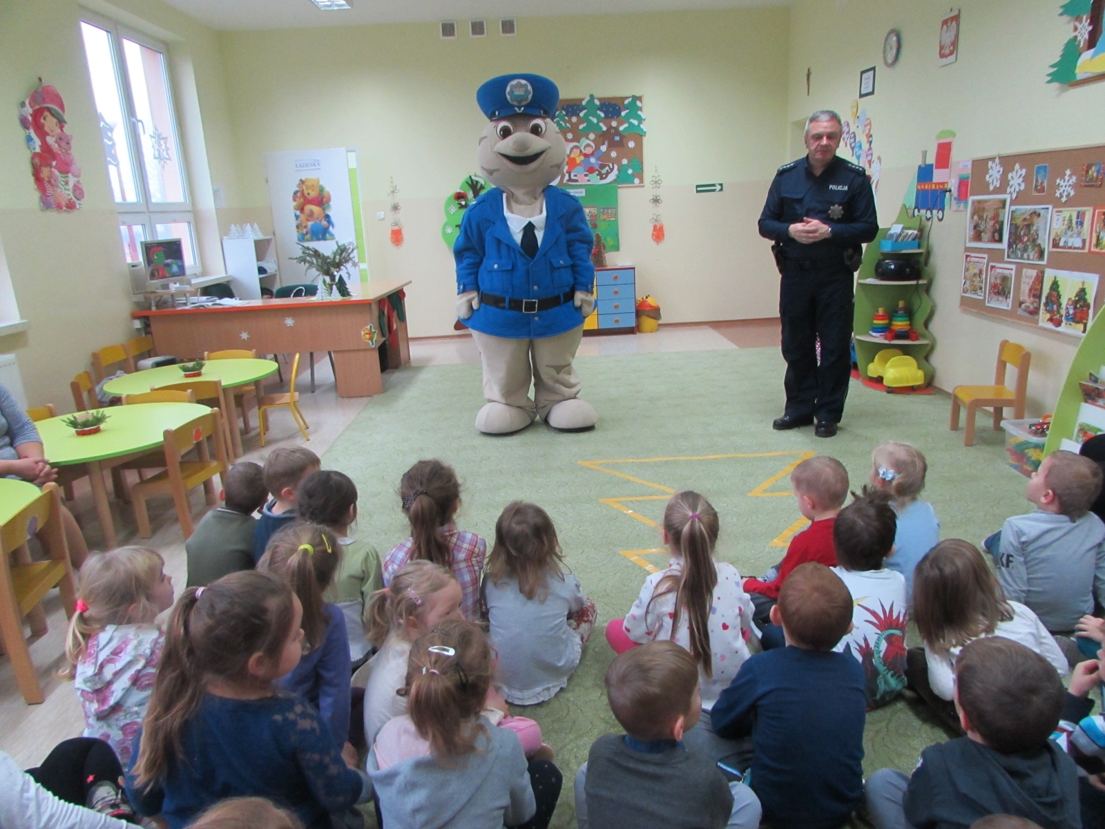 20 grudnia 2016r. w oddziale przedszkola przy ul. Parkowej odbyło się spotkanie dzieci z wszystkich grup z policjantem asp. sztab. Krzysztofem Aleksanderkiem. Pan Krzysztof tym razem odwiedził przedszkolaków w towarzystwie maskotki policyjnej – Pyrka. Celem spotkania było zapoznanie dzieci z podstawowymi zasadami bezpieczeństwa w okresie świątecznym. Dowiedziały się m.in. jak bezpiecznie zachowywać się podczas podróży, zakupów, jak właściwie reagować na kontakty z osobami nieznajomymi, w sytuacji, gdyby się zagubiły. Dzieci pochwaliły się znajomością telefonów alarmowych. Ponadto pan policjant opowiedział im jak bezpiecznie korzystać z uroków nadchodzącej zimy – dzięki czemu przedszkolaki potrafią odróżnić bezpieczne miejsca zabaw na śniegu i lodzie oraz mają świadomość zagrożeń. Zaintrygowane obecnością Pyrka, który jak zawsze potrafił nawiązać z nimi świetny kontakt, zapamiętają zapewne wszystkie cenne uwagi i przestrogi wpływające na ich zachowanie w różnych sytuacjach.