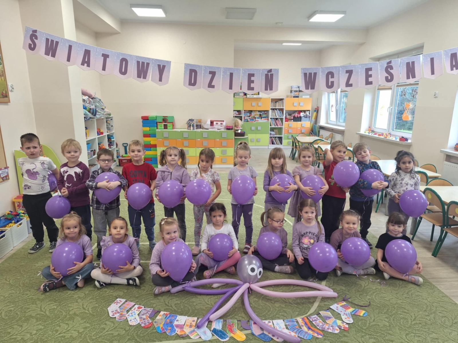 Światowy Dzień Wcześniaka obchodzony jest 17 listopada. Przedszkolaki z grupy Żabki poznały cel święta, powiększyły świadomość dotyczącą przedwczesnych narodzin, rozwoju i potrzeb wcześniaków oraz wsparcia ich rodzin. W tym dniu królował kolor fioletowy – symbol siły i delikatności. Były fioletowe ubranka, fioletowe balony i fioletowe skarpetki. Symbolem wcześniactwa jest 10 dziecięcych skarpetek , z których jedna jest dużo mniejsza od pozostałych. Oznacza, że co 10 noworodek jest wcześniakiem. Dodatkowo, symbolem jest również ośmiorniczka. Macki ośmiorniczki przypominają dziecku pępowinę, co daje mu poczucie bezpieczeństwa. Wszystkim Małym Bohaterom życzymy dużo zdrowia i miłości Rodzicom jak najmniej trosk, wytrwałości w pokonywaniu problemów dnia codziennego. Nasz fioletowy dzień zorganizowaliśmy dzięki fantastycznej akcji MatkoweLove. Dziękujemy.