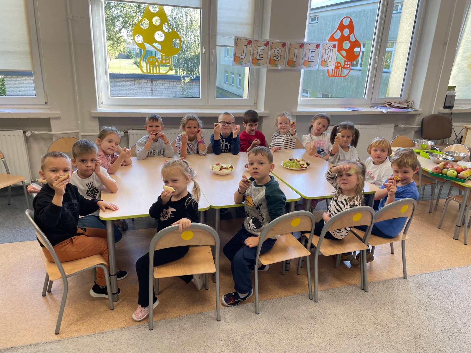 03 października 2025r. grupa VII „Wiewióreczki” zrealizowała pierwsze zadanie w ramach projektu „Rok Dziecięcej Kreatywności Interdyscyplinarne Warsztaty Terapeutyczne dla uczniów z SPE” autorstwa Anny Moździerz pod tytułem „Szelest barw w dziecięcych dłoniach”. Warsztaty pozwoliły dzieciom poznać piękno i mnogość barw towarzyszących nam jesienią. Zajęcia rozpoczęliśmy zabawą integracyjną „Wiewióreczki do dziupli”. Następnie dzieci zatańczyły znany im taniec do piosenki „Kolorowe listki”, ale tym razem z prawdziwymi jesiennym listkami. Po zabawach ruchowych usiedliśmy do stolików, aby wykonać pracę plastyczną – jesienne drzewo z prawdziwymi liśćmi zebranymi przez dzieci na spacerze, który odbyliśmy dzień wcześniej. Warsztaty zakończyliśmy słodkim i zdrowym poczęstunkiem składającym się z owoców zbieranych jesienią w sadzie: jabłek, gruszek, śliwek oraz winogron. Dzieciom najbardziej posmakowały gruszki oraz spodobały się wspólne rozmowy na „jesienne” tematy.