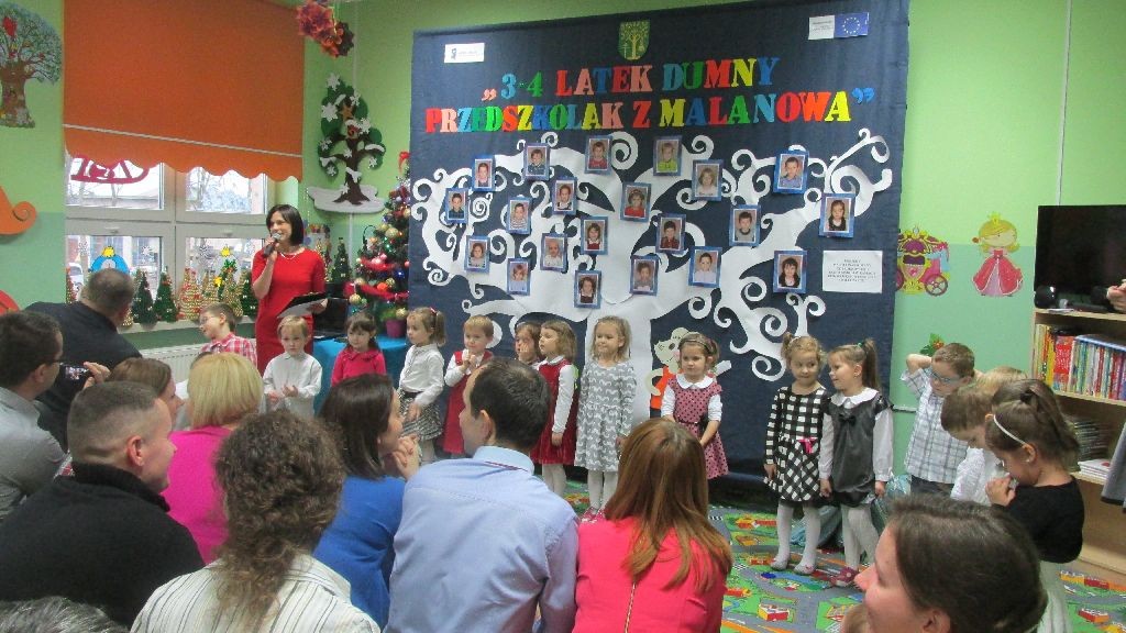 Dnia 18.12.2014r., w siedzibie Gminnego Przedszkola w Malanowie przy ul. Parkowej odbyło się uroczyste zakończenie projektu pt. „3 i 4 latek - dumny Przedszkolak z Malanowa" współfinansowanego z Europejskiego Funduszu Społecznego ( w ramach POKL, Priorytetu IX, Działania 9.1, Poddziałania 9.1.1). Na uroczystość tę przybyli zaproszeni goście w osobach: wicewójt gminy Malanów p. Piotr Cyls, wiceprzewodnicząca Rady Gminy p. Bożena Kołek, kierownik GZOO p. Katarzyna Gorgolewska – Erkiet, kierownik projektu p. Karolina Podgajna, Dyrektor Gimnazjum p. Krystyna Sobczak, a także pracownicy GZOO, nauczyciele zajęć dodatkowych, pracownicy przedszkola oraz przedstawiciele Rady Rodziców. Uroczystość rozpoczęła Dyrektor Gminnego Przedszkola w Malanowie p. Agnieszka Mozio witając przybyłych gości, dzieci i ich rodziców dziękując wszystkim osobom zaangażowanym w realizację projektu. Uroczystość uświetnił występ słowno-muzyczno-taneczny dzieci uczestniczących w projekcie. Przedszkolaki dziękując przybyłym gościom i nauczycielom wręczyli zakupione przez rodziców kwiaty. Następnie kierownik projektu p. Karolina Podgajna podsumowując omówiła realizowane działania jednocześnie dziękując uczestnikom, rodzicom, nauczycielom oraz wszystkim osobom zaangażowanym w realizację projektu po czym wręczyła dzieciom dyplomy i pamiątkowe upominki. W dalszej części spotkania głos zabrali zaproszeni goście gratulując dzieciom oraz składając serdeczne życzenia i słodycze. Uroczystość ta zakończyła się wspólnym poczęstunkiem zgromadzonych gości, nauczycieli, dzieci i ich rodziców.